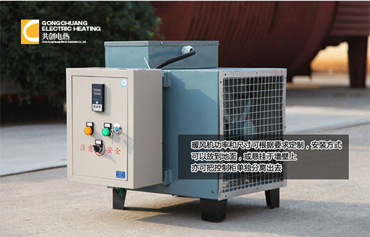 暖风机是一款固定在墙壁或棚顶上使用的电热取暖产品,适合厂房、车库、地下室、烘干室等场所使用。暖风机通过风机的旋转,强制空气循环,有利于空气的加热,适合间断采暖的场所使用。设备上配置开关,但如果安装高度过高,直接在设备上操作不方便,订货时可选择将开关安装在墙壁上的线控机型。需要新风换气的场所,可以将设备与新风管道进行连接,通过风阀调节新风量。固定在墙壁或者棚顶上使用,节约地面空间,选择吊挂在棚顶上的安装方式,订货时请声明。
